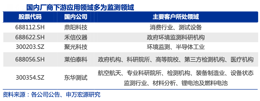 經典案例:根據各公司公告、申萬宏源等綜合資訊表明,以五家國產科研儀器制造商為例,主要大客戶集中于環境監測領域和工業應用領域,多為政府機構。在此類領域中,客戶國產化需求較高,大多國內企業于此發力。事業單位客戶類型較為集中,客戶穩定性高,國產科學儀器制造商具備發展機遇。