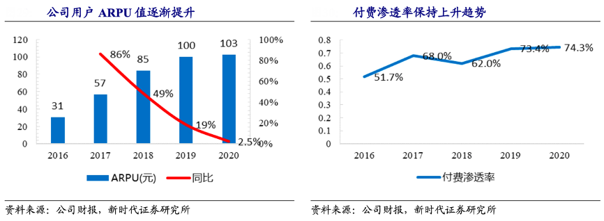 經典案例:根據公司財報、新時代證券研究所等綜合資訊表明,家鄉互動公司 2020 年 ARPU 為 103 元,同比提升 3 元,維持上升趨勢;從付費滲透率方面可以看出,公司用戶的付費滲透率整體保持上升趨勢,從活躍用戶到付費用戶的存量用戶價值挖掘過程穩步推進。