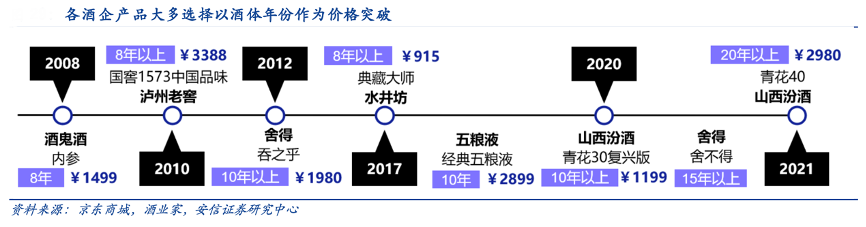 經典案例:根據京東商城、酒業家和安信證券研究中心等綜合資訊表明,酒體年份作為產品價值的清晰刻度,對高端產品價格定位具備有力支撐,國內酒企近年來做高端布局也都紛紛以“+年份”作為突破方向。
