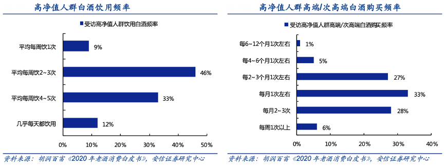 經典案例:根據胡潤百富《2020年老酒消費白皮書》、安信證券研究中心等綜合資訊表明,高凈值人群(家庭平均資產規模達 650 萬)對白酒消費有較高訴求。從消費頻次看,受訪者平均白酒飲用頻次高達每周 3.6 次,其中45%的受訪者的白酒飲用頻次在每周 4 次以上;受訪者對次高端以上白酒的平均購買頻次達每月 1.4 次,其中67%的受訪者每月都會購買,27%的受訪者會按季購買。