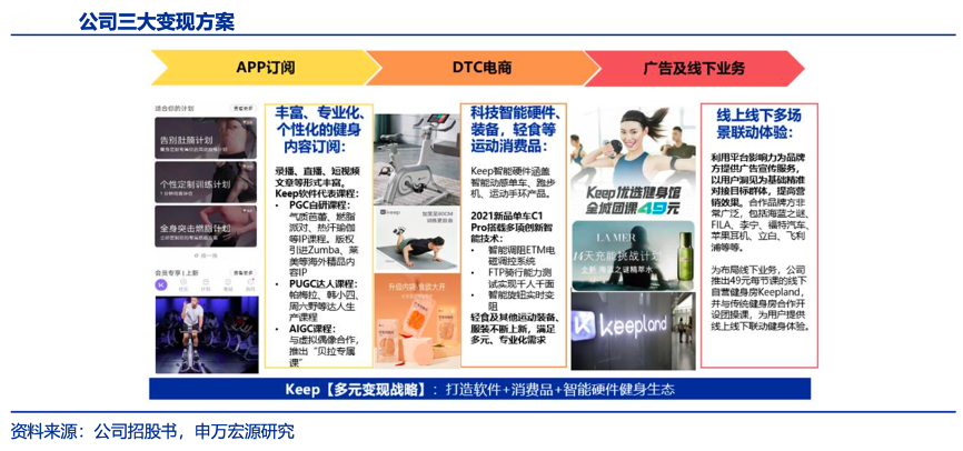 經典案例:根據公司招股書、申萬宏源研究等綜合資訊表明,以流量為基礎,Keep公司打造軟件+消費品+智能硬件的健身生態,降低運動門檻,提升運動體驗,在全流程運動方案中促成流量變現。目前其公司的收入來源主要包括會員訂閱及線上付費內容、自有品牌產品、廣告和其他服務(含線下健身館收入),2021年前三季度其收入占比分別為 33%、55%、12%,毛利率分別為59%、29%、60%。