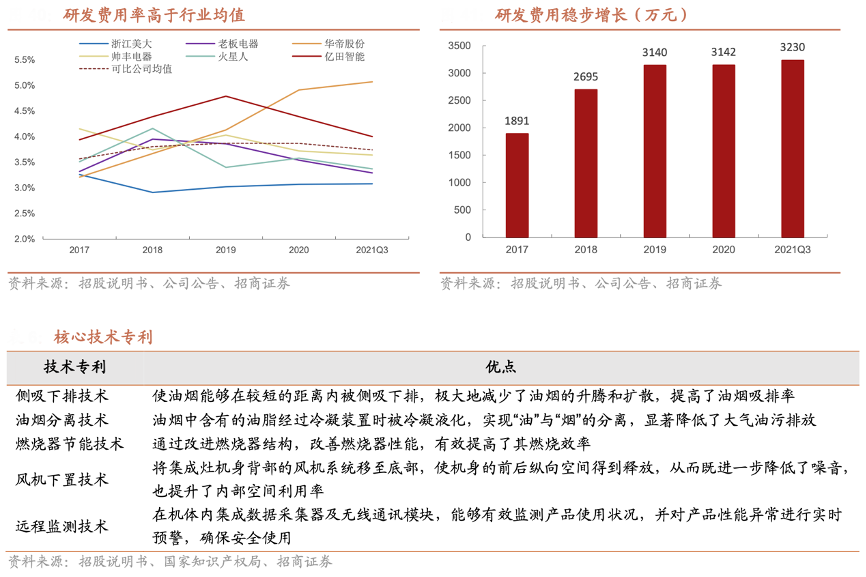 經典案例:根據招股說明書、國家知識產權局、公司公告、招商證券等綜合資訊表明,近年來億田公司研發費用穩步增長,成立技術 發中心(獲評浙江省級高新技術企業研究開發中心)、廚房電器檢測實驗中心(獲得 CNAS 認證),其已形成側吸下排技術、風機下置技術等五大技術專利,對集成灶油煙吸排率、油煙分離率、燃效效率、空間利潤率及安全性等指標做出性能提升。得益于對行業標準變革的重要引領作用,億田公司于2015年成為集成灶行業首家獲得“浙 江制造”認證的企業,并榮獲2017年度浙江省人民政府質量獎。