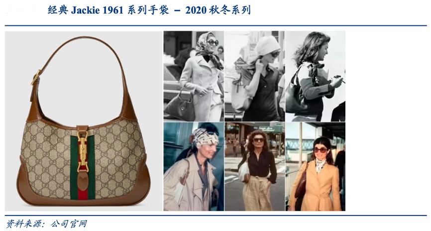 經(jīng)典案例:根據(jù)公司官網(wǎng)、華創(chuàng)證券等綜合資訊表明,奢侈品品牌相對于快時尚品牌而言,更依賴于核心產(chǎn)品的銷售,季節(jié)性產(chǎn)品更多是保留經(jīng)典元素的同 時進行創(chuàng)新,保持品牌的完整性,增加熱度。奢侈品牌需要在保持品牌調(diào)性和提供符合趨勢的流行產(chǎn)品之間保持平衡。Gucci 以美國第一夫人 Jacqueline Kennedy Onassis 命名的Jackie Bag 于 2020 秋冬重新回歸,將 60 年代的經(jīng)典半月形手袋再度升級。