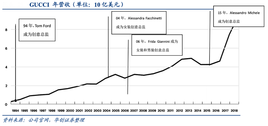 經(jīng)典案例:根據(jù)公司官網(wǎng)、華創(chuàng)證券等綜合資訊表明,設(shè)計師是奢侈品品牌營收增長的關(guān)鍵因素。明星創(chuàng)意總監(jiān)對奢侈品營收有明顯提振作用,例如 Tom Ford 和 Alessandro Michele 于 Gucci , Alexander Wang 于 Balenciaga,Phoebe Philo 于 Celine,1994 年,Tom ford 出任 Gucci 創(chuàng)意總監(jiān),挽救品牌于頹勢,1999 年 Gucci 收 購 YSL 后,Tom Ford 又成為 YSL 創(chuàng)意總監(jiān)。2018 年,LV 男裝設(shè)計師 Kim Jones 轉(zhuǎn)移成為 Dior 設(shè)計師。
