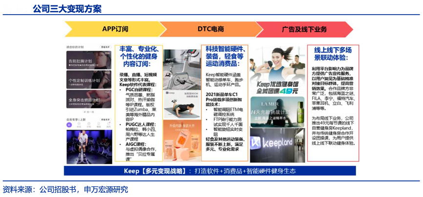 經典案例:根據公司招股書、申萬宏源研究等綜合資訊表明,以流量為基礎,Keep公司打造軟件+消費品+智能硬件的健身生態,降低運動門檻,提升運 動體驗,在全流程運動方案中促成流量變現。目前其收入來源主要包括會員訂閱及線上付費內容、自有品牌產品、廣告和其他服務(含線下健身館收入),2021 年前三季度其 收入占比分別為 33%、55%、12%,毛利率分別為 59%、29%、60%。以龐大用戶群為 基礎,共生的商業模式為平臺帶來了交叉銷售的機會。