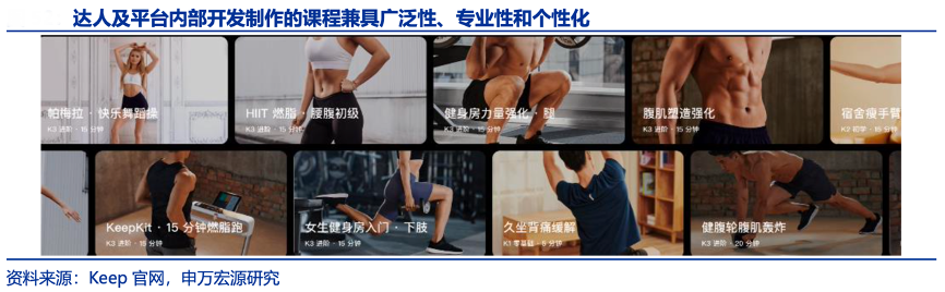 經典案例:根據Keep官網、申萬宏源研究等綜合資訊表明,Keep平臺內容在數量和廣度上均 較廣泛,根據招股書,截至 2021 年 12 月 31 日,平臺內部開發內容、達人開發內容,以及其他內容提供者貢獻了約 7,600 節錄播課。提供的內容包括力量訓練、有氧運動、舞蹈、拳擊、跑步、拉伸、瑜伽、普拉提、冥想和太極。從場景來看,平臺內容仍以家庭為核心,暫未涉及滑雪、潛水等項目。