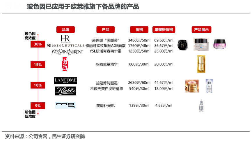 經典案例:根據公司官網、民生證券研究院等綜合資訊表明,海外品牌中,歐萊雅專業實驗室于 2006 年研發出一種活性抗衰老成分“玻色因”,該成分以西歐山毛櫸中的木糖為原材料,采用綠色化學合成工藝來生產,擁有大量基礎研究作背書,抗衰老效果顯著。目前,玻色因已成為歐萊雅集團的標志性抗衰老成分,在赫蓮娜、修麗可、YSL、羽西、蘭蔻、科顏氏、美即等品牌的產 品中應用,市場反響良好。