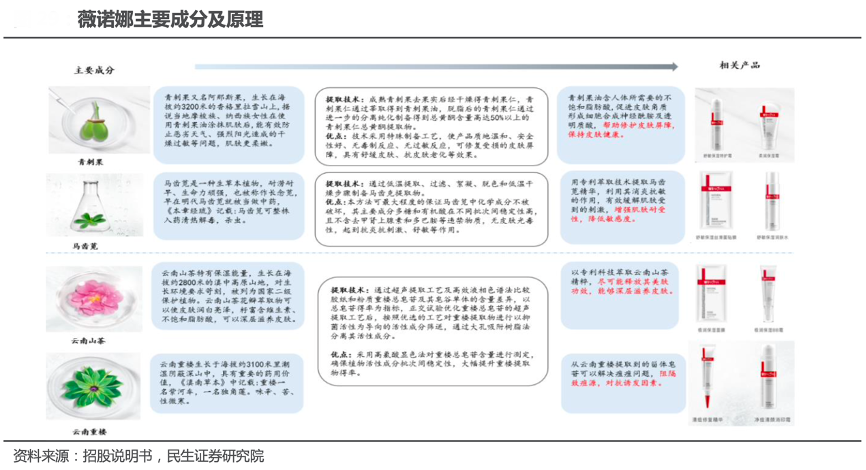 經典案例:根據招股說明書、民生證券研究院等綜合資訊表明,華熙生物在配方上不斷進階,“潤百顏蜂巢玻尿酸次拋原液”原料中兩種核心成分均為透明質酸鈉,剩余添加成分較少,功能直指保濕。隨著我國消費者對化妝品成分的認知不斷加深,專一溫和直接的護膚品配方將更受歡迎。