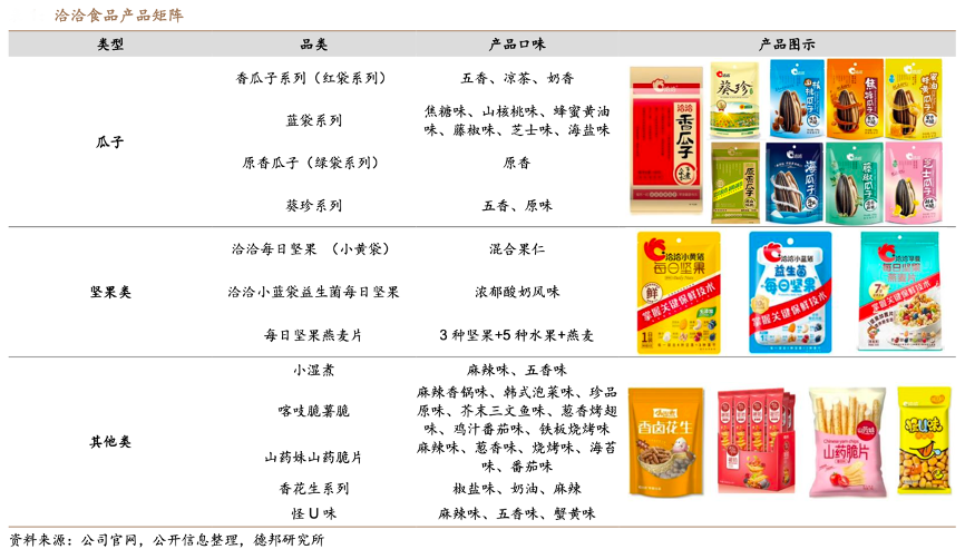 經典案例:根據(jù)公司官網、公開信息整理、德邦研究所等綜合資訊表明,洽洽食品在傳統(tǒng)優(yōu)勢主業(yè)——瓜子品類上,其在經典紅袋系列基礎上,開發(fā)出藍袋及綠袋系列,在產品口味、包裝等 方面實現(xiàn)不斷的創(chuàng)新升級。同時推出高端瓜子品牌“葵珍”,進一步豐富瓜子產品矩陣布局。
