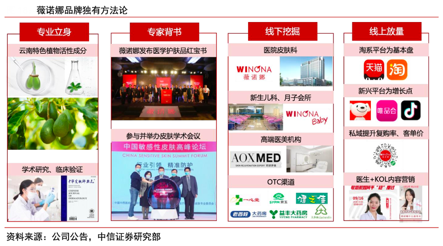 經典案例:根據公司公告、中信證券研究部等綜合資訊表明,貝泰妮公司通過主品牌薇諾娜的發展探索出了獨有的“貝式”方法論:專業立身,專家背書,線下挖掘,線上放量。該方法論以高產品力為起點,即產品要真正做到安全、有效;同時 整合皮膚科醫生、學術會議/論壇、醫院渠道等資源,在線下挖掘出目標客群,通過內容營銷、全域運營在線上渠道放量、出圈。