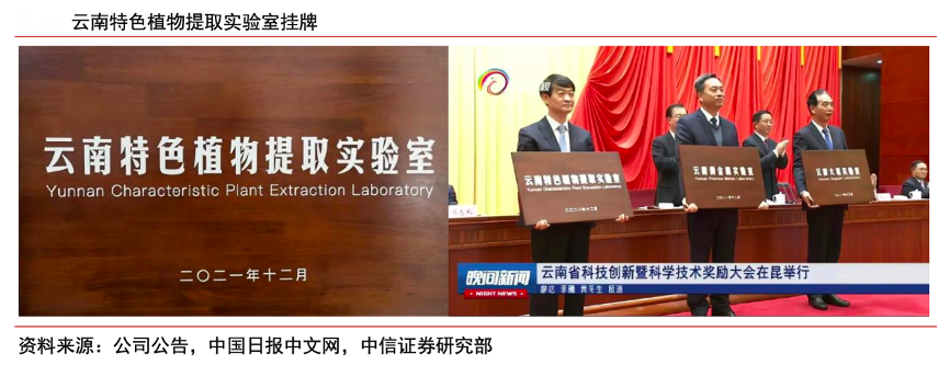 經典案例:根據公司公告、中國日報中文網、中信證券研究部等綜合資訊表明,貝泰妮2021年末云南特色植物提取實驗室正式授牌,其是經云南省委、省政府批準成立的 獨立法人實體新型研發機構,由公司的全資子公司云南云科牽頭承辦建設工作。實驗室以云南特色植物作為研發發動機,支撐未來云南千億特色植物產業發展。同時聚焦云南特色植物的功效性化妝品、功效性食品及藥品的研發,有望在未來實現技術突破,為貝泰妮帶來新的增長曲線。