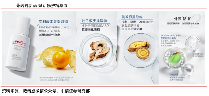 經(jīng)典案例:根據(jù)諾薇娜微信公眾號(hào)、中信證券研究部等綜合資訊表明,2022年 3 月 26 日,薇諾娜推出新品-敏感肌抗初老輕顏瓶“賦活修護(hù)精華液”,主打 淡化細(xì)紋,修護(hù)肌底功效。同時(shí)配合微囊科技,能夠持久釋放舒緩活性物質(zhì),增強(qiáng)抗衰老功效。