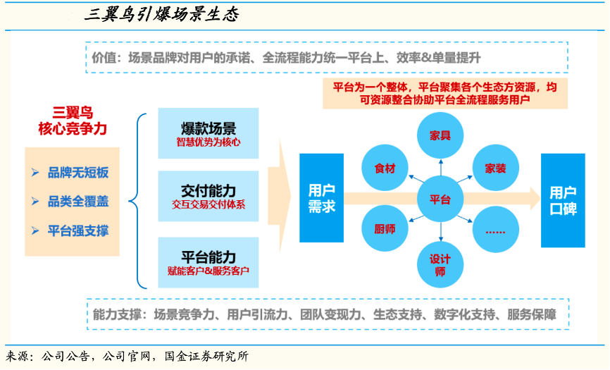 經典案例:根據公司公告、公司官網、國金證券研究所等綜合資訊表明,卡薩帝三翼鳥具有“1+N ”服務體系,通過一個服務管家、一個項目經理,即可協同家電服務人員、成套服務商、經銷商、家裝公司等N個資源方,是一個多方資源匯集、最終輸出整體解決方案給客戶的平臺。消費者僅需在 APP 上一鍵下單,各個資源方將在三翼鳥的牽頭整合下,協同為用戶提供全流程的設計與 交付服務 ,對公司的數字化 能力和對 生態方的 管理能力提出了高要求。