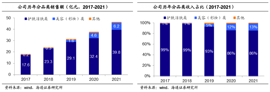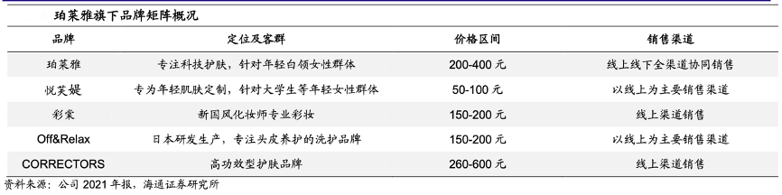 經典案例:根據公司2021年報、海通證券研究所等綜合資訊表明,珀萊雅公司致力于構建新國貨化妝品產業平臺,主要從事化妝品類產品的研發、生產和銷售。旗下主要擁有“珀萊雅”、“彩棠”、“Off&Relax”、“悅芙媞”、“CORRECTORS”、“優資萊”、“韓雅”等品牌。其自有品牌已覆蓋大眾精致護膚、彩妝、洗護、高功效護膚等美妝領域。