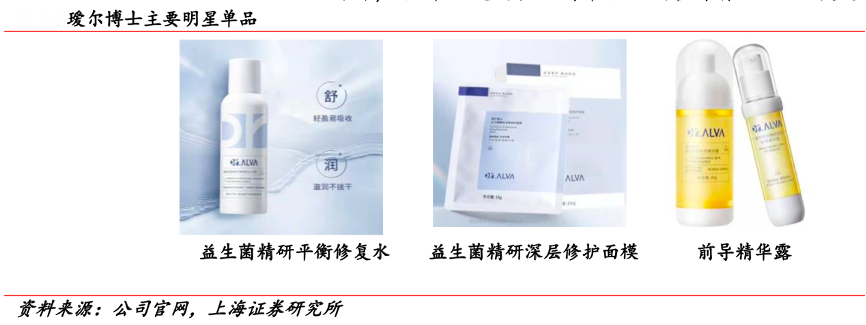 經典案例:根據公司官網、上海證券研究所等綜合資訊表明,璦爾博士定位微生態護膚,旗下主要品類為面膜、水乳、潔面乳、營養液、保濕霜、精華液、 修護水等;產品含有二裂酵母、奧婷敏等多種微生態成分,有效的修復肌膚屏障。