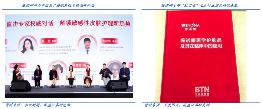 經(jīng)典案例:根據(jù)和訊網(wǎng)、百度圖片、國盛證券研究所等綜合資訊表明,薇諾娜不斷加深學(xué)術(shù)資源和專業(yè)壁壘,目前擁有約 60 項(xiàng)專利和 11 項(xiàng)核心技術(shù)。2017年薇諾娜聯(lián)合頂尖皮膚科醫(yī)生發(fā)布“紅寶書”《薇諾娜醫(yī)學(xué)護(hù)膚品 及其在臨床中的應(yīng)用》,收錄國內(nèi)外核心期刊發(fā)表的 128 篇基礎(chǔ)研究和臨床驗(yàn)證論文,成為行業(yè)技術(shù)引領(lǐng)。同時(shí)2020-2021年,薇諾娜聯(lián)合五大行業(yè)協(xié)會(huì)先后舉辦兩屆敏感性皮膚高峰論壇,聚合產(chǎn)學(xué)研各方力量探討最新研究成果,并聯(lián)合專家共同頒布行業(yè)標(biāo)準(zhǔn)。