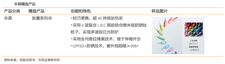 經典案例:根據招股說明書、天風證券研究所等綜合資訊表明,2013年蕉下防曬傘推出后受到極大歡迎,至今仍是其旗艦產品之一。傘具產品輕便小巧且具備科技支持的防曬功能,采用 L.R.C 涂層、全向推拉蜂巢技術及靜音蜂巢技術等科技,給客戶帶來更好的遮陽、耐用性及流暢使用體驗。同時,其提供三折傘、五折傘和六折傘,以滿足不同客戶需求,其設計多樣、風格各異,包括浮世 繪風格和中國古典風格。