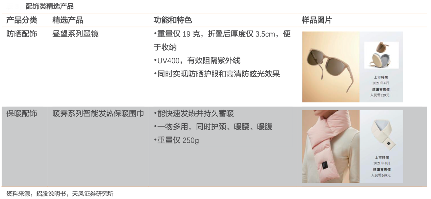 經典案例:根據招股說明書、天風證券研究所等綜合資訊表明,蕉下配飾包括保暖系列圍巾、手套和口罩等,溫暖舒適。例如,智能保暖圍巾配備石墨烯加熱墊,通電幾分鐘內即迅速升到舒適溫度,還包括多功能肩包、手提包及手提袋,方便戶外攜帶收納。