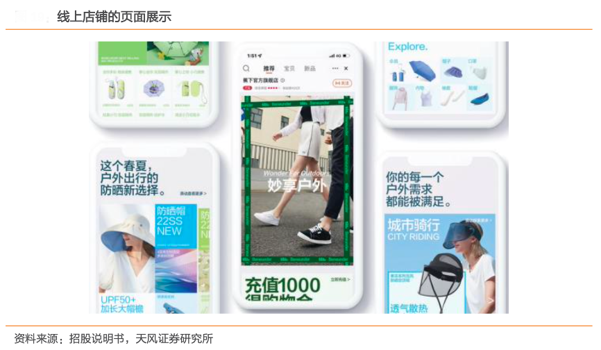 經(jīng)典案例:根據(jù)招股說(shuō)明書(shū)、天風(fēng)證券研究所等綜合資訊表明,蕉下客戶(hù)界面設(shè)計(jì)適合線上營(yíng)銷(xiāo),傳遞“妙享戶(hù)外”的品牌理念,刺激購(gòu)買(mǎi)欲望。截至 2022 年 4 月 3 日,其在中國(guó)絕大部分領(lǐng)先成熟電商平臺(tái)運(yùn)營(yíng)線上店鋪。其自 2020 年以來(lái),一直積極把握抖音等快速增長(zhǎng)內(nèi)容電商平臺(tái)的銷(xiāo)售機(jī)遇。