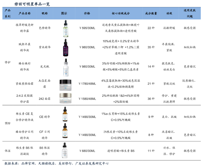 經(jīng)典案例:根據(jù)品牌官網(wǎng)、天貓旗艦店、美麗修行、廣發(fā)證券發(fā)展研究中心等綜合資訊表明,修麗可成功打造的明星單品包括主打修護的色修精華、發(fā)光瓶精華、紫米精華、A.G.E.面霜、242面霜,主打預(yù)防的CE精華、CF日間精華,以及主打保濕的B5精華。