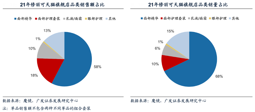 經(jīng)典案例:根據(jù)魔鏡、廣發(fā)證券發(fā)展研究中心等綜合資訊表明,2021年修麗可天貓旗艦店接近六成銷售額及七成銷量來源于面部精華品類,面部護理套裝和乳液/面霜品類分別貢獻(xiàn)約兩成及一成銷售額;2020-21年修麗可面部精華品類銷售額在天貓面部精華類目占比由2.8%增至5.0%,乳液面霜品類銷售額在天貓乳液面霜類目占比由0.5%增至1.1%。