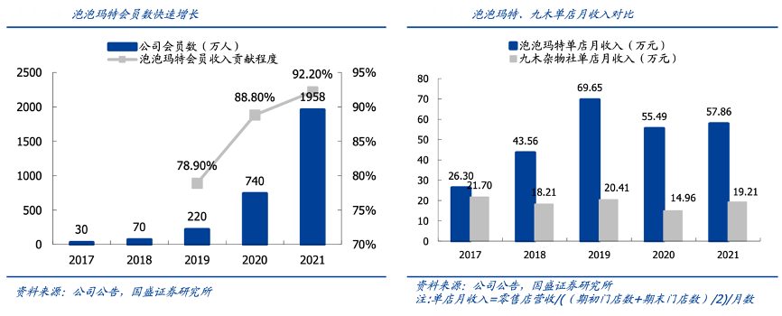 經典案例:根據公司公告、國盛證券研究所等綜合資訊表明,2019- 2021 泡泡瑪特會員數從 220 萬提升至 1958 萬,收入貢獻度從 78.9%提升至 92.2%; 而截至 2021 年,九木雜物社會員人數超 300 萬。