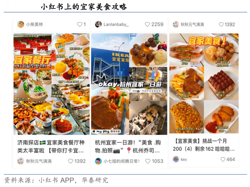經(jīng)典案例:根據(jù)小紅書APP、華泰研究等綜合資訊表明,宜家創(chuàng)造性地在門店中引入餐飲這類高流量場景,早在第一家宜家商場在瑞士成立時,考慮到顧客逛完大店后的疲憊感,宜家就專門開出小茶座,為 顧客提供甜點及飲料,這一經(jīng)營策略一直得以延續(xù)。時至今日,宜家美食已經(jīng)成為宜家商 場獨特的標簽,瑞典肉丸等爆品頻頻出圈,今日家居調(diào)查顯示宜家 30%的顧客進店是為了 品嘗美食,“1 元冰淇淋”則是宜家最暢銷的單品,平均年銷量超過 1200 萬只。