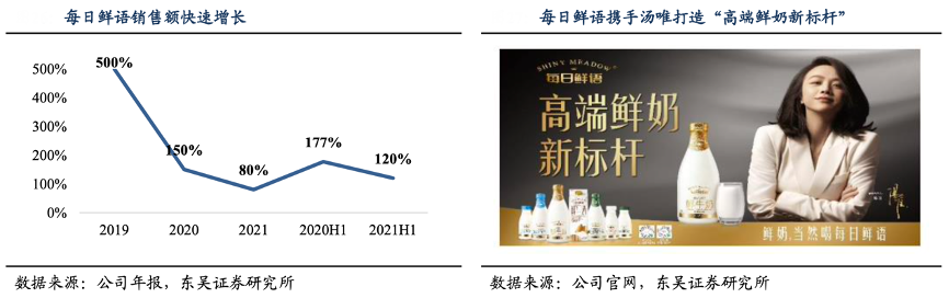 經典案例:根據公司年報、公司官網、東吳證券研究所等綜合資訊表明,每日鮮語憑借高標準牧場、高標準奶源、高標準管理,成為高端鮮奶代表品牌。2019-2021,每日鮮語持續(xù)升級產品,相繼推出 A2 鮮牛奶、有機鮮牛奶、迷你解 饞奶茶等。2020 年,每日鮮語簽約湯唯為代言人,深化品牌影響力,定位精致人群;并 與奈雪的茶、迪士尼等合作進行 IP 營銷吸引年輕消費群體,深化“高端鮮奶行業(yè)新標桿”形象。