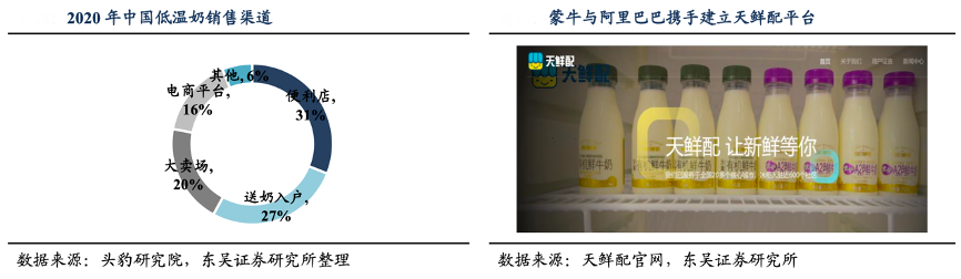 經典案例:根據頭豹研究院、天仙配官網、東吳證券研究所等綜合資訊表明,受制于保質期短和需低溫保存的特點,2020年低溫奶在便利店/送奶入戶/大賣場/電商平臺的渠道占比分別為 31%/27%/20%/16%,送奶入戶成為其特色渠道。2021年度,蒙牛鮮奶在京東、山姆會員店、永輝等渠道實現(xiàn)鮮奶銷售額第一名;O2O到家業(yè)務、社區(qū)生鮮平臺已實現(xiàn)綜合份額第一。