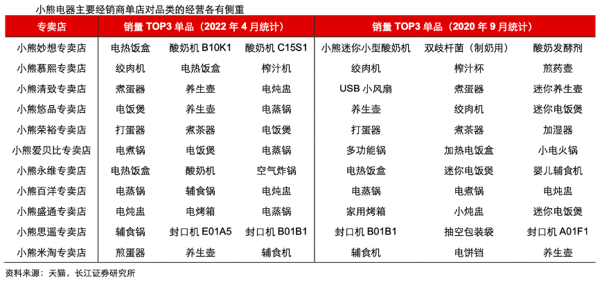 經(jīng)典案例:根據(jù)天貓、長(zhǎng)江證券研究所等綜合資訊表明,小熊電器公司不同經(jīng)銷商針對(duì)不同品類進(jìn)行首推和運(yùn)營(yíng),形成了多品類、多經(jīng)銷商的運(yùn)營(yíng)體系。小熊電器線上擁有眾多經(jīng)銷商,且不同經(jīng)銷商單店銷量最高產(chǎn)品幾乎沒(méi)有重復(fù),通過(guò)合理有序的安排主推產(chǎn)品,可以避免經(jīng)銷商之間產(chǎn)生惡性同質(zhì)化競(jìng)爭(zhēng),并且資源集中的方式可以幫助產(chǎn)品曝 光的覆蓋面加大;而對(duì)于孵化時(shí)間較短、尚未成規(guī)模的新產(chǎn)品,主要由公司直營(yíng)店鋪進(jìn)行銷售和宣傳。
