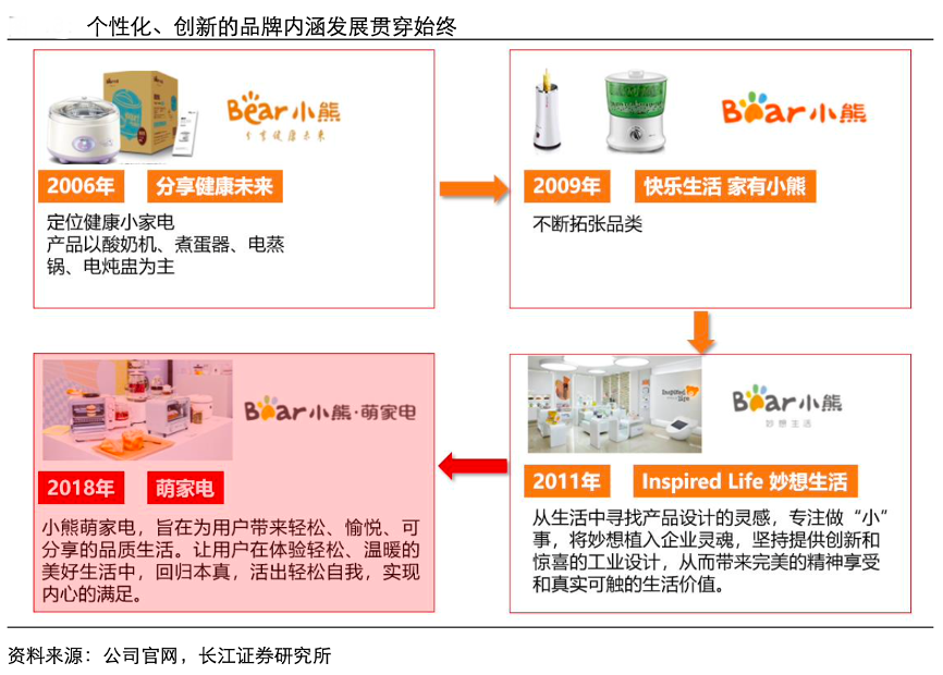 經(jīng)典案例:根據(jù)公司官網(wǎng)、長(zhǎng)江證券研究所等綜合資訊表明,早在 2006 年,小熊電器公司在廣州佛山成立的初始階段,其已開(kāi)發(fā)了酸奶機(jī)、煮蛋器、電蒸鍋、電燉盅等當(dāng)前仍在熱銷的小家電細(xì)分品類;此后,其品牌內(nèi)涵不斷迭代和演化,“健康未來(lái)”—“快樂(lè)生活”—“妙想生活”—“萌家電”,無(wú)一不是從區(qū)別于美九蘇的差異化定位出發(fā)。