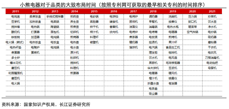 經(jīng)典案例:根據(jù)國家知識產(chǎn)權(quán)局、長江證券研究所等綜合資訊表明,從品類最早涉及的相關(guān)專利時間來看,小熊電器公司大部分品類的研發(fā)時間較早,提前針對性地做好產(chǎn)品儲備;如 2011 年涉及到的加熱杯 墊在近年來消費熱點逐步出現(xiàn),如 2012 年涉及到的加熱飯盒在 2020 年受益于疫情快 速爆發(fā),如 2019 年公司研發(fā)了按摩儀的對應(yīng)產(chǎn)品,而 2020 年以來按摩儀系列產(chǎn)品的行業(yè)消費景氣度持續(xù)較優(yōu)。可見公司對于小家電的產(chǎn)品品類覆蓋面較廣,且大部分品類的相關(guān)儲備做得較早,走在市場需求之前。