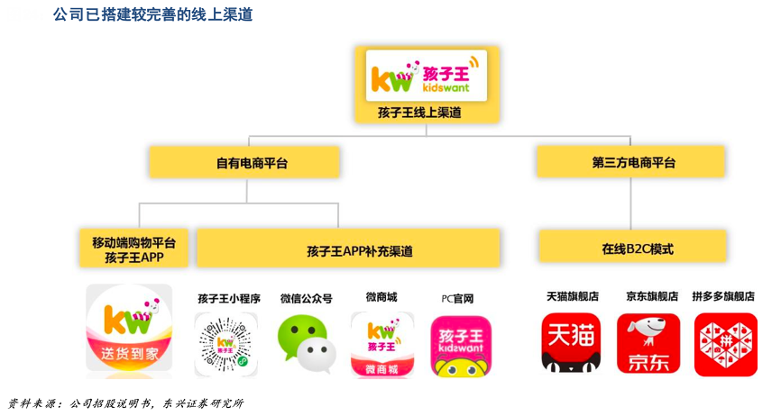 經(jīng)典案例:根據(jù)公司招股說明書、東興證券研究所等綜合資訊表明,面對近年來零售渠道的線上化轉(zhuǎn)型,孩子王已搭建較為完善的線上銷 售體系。其主要通過移動端購物平臺(孩子王 APP)、微信平臺(孩子王公眾號、小程序、微商城)、 PC 端購物平臺(孩子王網(wǎng)上商城)等網(wǎng)絡(luò)平臺開展線上業(yè)務(wù),還通過第三方電商平臺“天貓商城”、“京東”、“拼多多”開設(shè)“孩子王官方旗艦店”。 2019 年公司的孩子王 APP 在 Trustdata 母嬰電商類 APP 的排名第一。