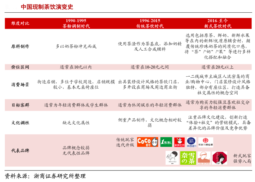 經(jīng)典案例:根據(jù)浙商證券研究所等綜合資訊表明,新式茶飲的原料追求多樣化、高標(biāo)準(zhǔn),打造“茶、奶、果”的完美融合,單杯價(jià)格普遍在 20 元以上,門店主要布局在大型商場(chǎng)一樓的核心點(diǎn)位,對(duì)商場(chǎng)起到引流作用。這一階段的茶飲注重品牌文化建設(shè),消費(fèi)場(chǎng)景升級(jí),社交屬性顯現(xiàn),新入局的典型玩家包括喜茶、奈雪的茶等,引領(lǐng)行業(yè)新發(fā)展。
