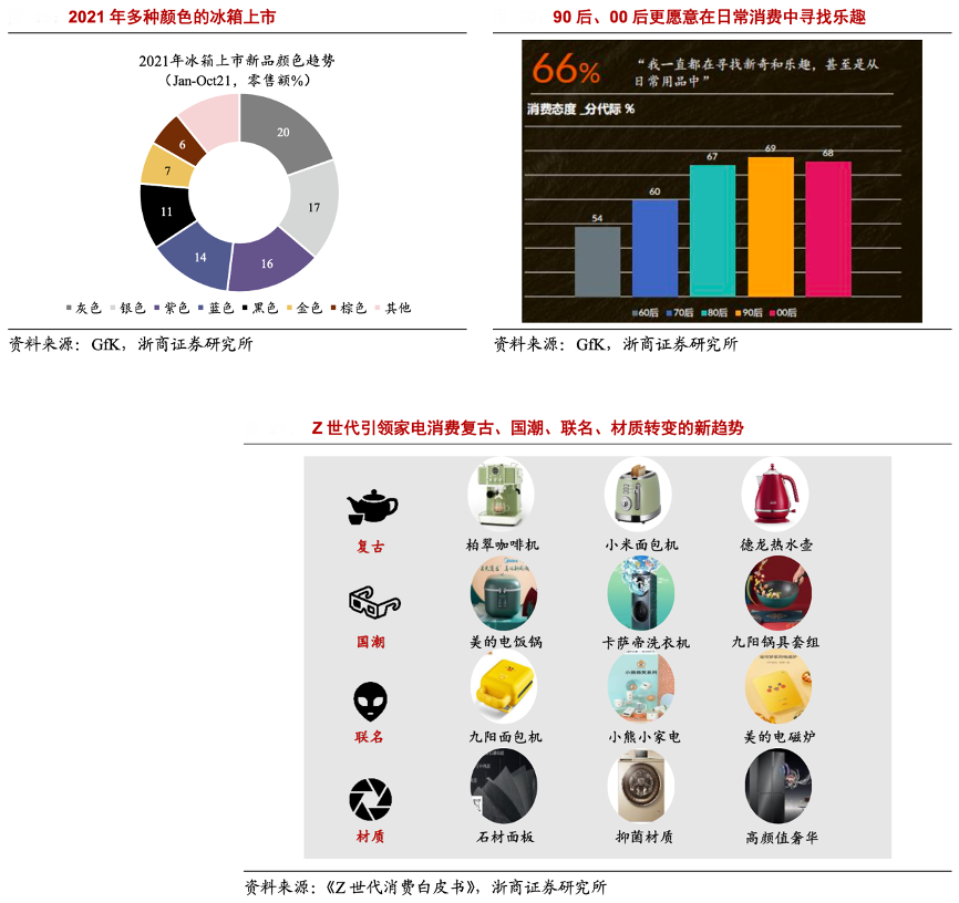 經(jīng)典案例:根據(jù)GfK、《Z世代消費(fèi)白皮書》、浙商證券研究所等綜合資訊表明,Z世代群體注重個(gè)性需求、在消費(fèi)品中追求幸福及樂(lè)趣,在消費(fèi)態(tài)度上,有 65%+的 90 后、00 后的態(tài)度是追求新奇和樂(lè)趣,以及潮流的生活;同時(shí)全新的消費(fèi)理念能夠?yàn)榧译姰a(chǎn)品帶來(lái)更高的溢價(jià),從外觀上看,家電藝術(shù)凸顯審美提升消費(fèi)幸福感,顏色和材質(zhì)都發(fā)生了變化。例如卡薩帝冰箱推出原石高定系列,采用石材面板,首發(fā)價(jià)格達(dá)到 15000 元;三星推出 The Frame 畫壁系列電視,其效果為開(kāi)啟時(shí)是一臺(tái)電視機(jī),關(guān)閉時(shí)是畫框,75英寸售價(jià)為 1.8 萬(wàn)元。