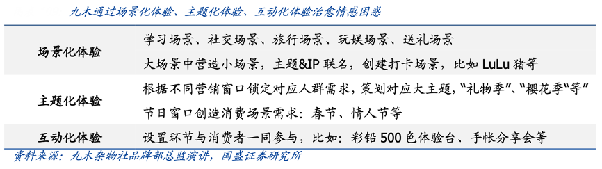 經(jīng)典案例:根據(jù)九木雜物社品牌部總監(jiān)演講、國盛證券研究所等綜合資訊表明,年輕群體主要有三大主要情感困惑:孤獨(dú)、被需要和安全感,相比商品價(jià)格、質(zhì)量,更看重品牌的情感連接。九木以“體驗(yàn)、場景、治愈”為核心建設(shè)線下門店,通過場景化體驗(yàn)、主題化體驗(yàn)、互動化體驗(yàn)構(gòu)建與消費(fèi)者之間的情感連接,傳遞“可逛、可淘的文創(chuàng)雜貨店”品牌認(rèn)知。