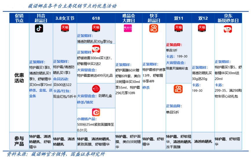經(jīng)典案例:根據(jù)薇諾娜官方微博、國盛證券研究所等綜合資訊表明,薇諾娜積極參與平臺促銷,促銷節(jié)點采取多樣化組合的方式,小促采用小樣拉新/大套盒/卡券紅 包/抽獎秒殺等多種形式有力拉新,大促則以大單品直接打折為主,強力驅(qū)動銷量增長。產(chǎn)品展示方面,其突出品牌專業(yè)性,詳情頁多方面展示肌膚問題形成原因及產(chǎn)品專利等內(nèi)容,提升消費者信任度。
