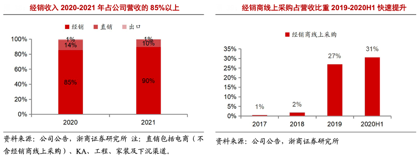 經典案例:根據公司公告、浙商證券研究所等綜合資訊表明,億田智能經銷模式為主,經銷商線上采購快速發展。2020-2021年其經銷模式分別占營收的 85%、90%,經銷包括經銷商線上采購及經銷商線下采購。其公司2019 年起線上采購收入 占比快速提升,從 2018 年的 2%提升至 2020H1 的 31%,主要是由于公司大力推廣經銷商線上采購,并推出線上專供款集成灶。