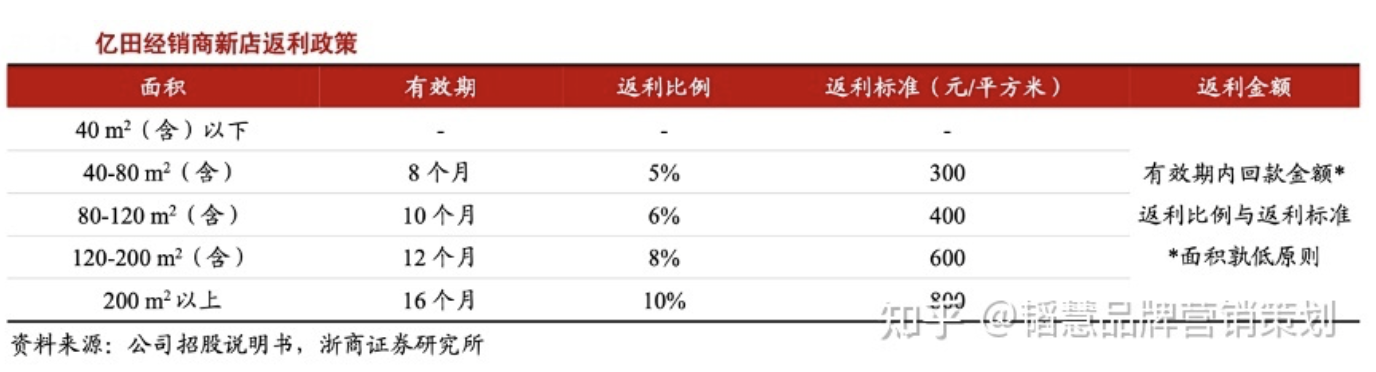 經典案例:根據公司招股說明書、浙商證券研究所等綜合資訊表明,具體來看新店返利政策,億田更鼓勵開大店。根據公司招股書,40 平及以下新店無 返利資格,40-80 平(含)、80-120 平(含)、120 平至 200 平(含)、200 平以上的返 利比例分別為 5%、6%、8%、10%,返利標準分別為 300 元/平、400 元/平、600 元/平、800 元/平,大店的返利越高。