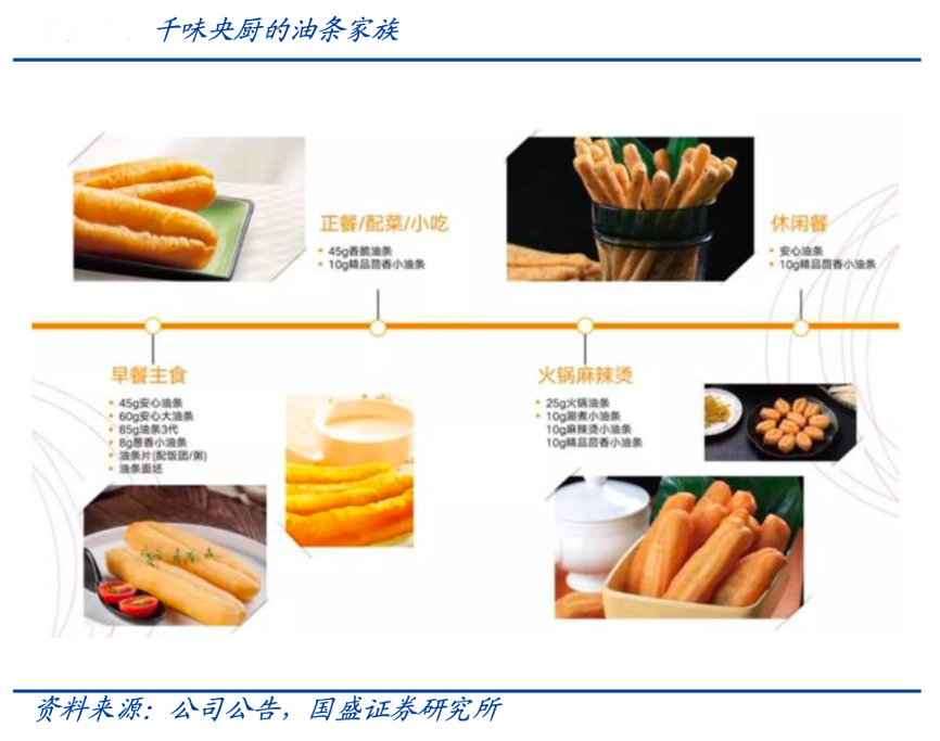 經典案例:根據公司公告、國盛證券研究所等綜合資訊表明,以大單品油條為例,千味央廚公司自 2012 年起就著手油條細分市場的探索與創新研發,確定了火鍋、快餐、自助餐、宴席、早餐、外賣六大場景,針對性推出茴香小油條、麻辣燙小油條、火鍋涮煮油條、外賣專用油條等多款創新性產品,有利于利用單品知名度迅速提升新細分子領域市場份額。