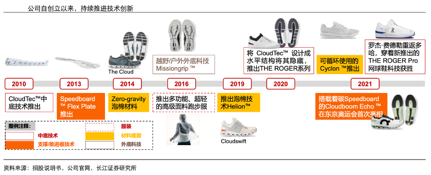 經(jīng)典案例:根據(jù)招股說明書、公司官網(wǎng)、長江證券研究所等綜合資訊表明,On Running(On/昂跑)致力于改善跑步體驗,CloudTec 中底技術(shù)+Speedboard+HelionTM Superfoam 泡棉材料構(gòu)成公司產(chǎn)品核心特色。