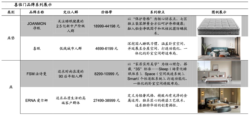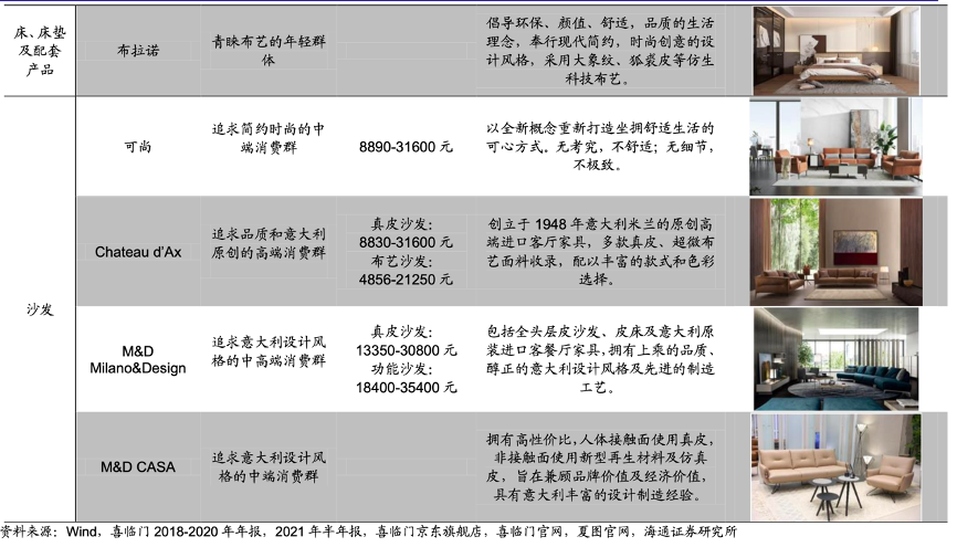 經典案例:根據wind、喜臨門2018-2020年年報、2021年半年報、喜臨門京東旗艦店、喜臨門官網、夏圖官網、海通證券研究所等綜合資訊表明,喜臨門以寢具為核心擴張品類,臥室與客廳協同發展。2021 年,喜臨門的床墊業務 實現營收 39.61 億元,占比 51.76%,較 2009 年下降 23.18pct。