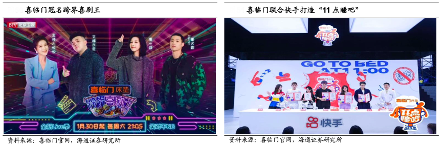 經典案例:根據喜臨門官網、海通證券研究所等綜合資訊表明,喜臨門獨家冠名了東方衛視的 2021 年播出的《中國新相親 4》和北 京衛視 2021 年播出的《跨界喜劇王》。除此之外,其2022年聯合快手打造國內首檔明星睡覺比賽《11點睡吧》,向大眾普及“睡吧 118”健康睡眠理念,超 1.1 億人在線觀看。