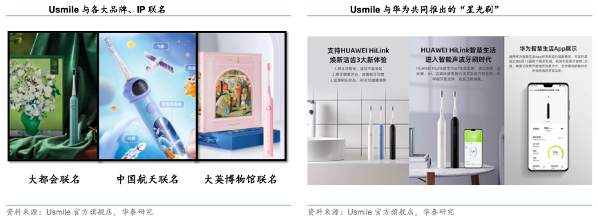 經典案例:根據Usmile官方旗艦店、華泰研究等綜合資訊表明,在包括電路板,電機在內的各項內部 構件中,Usmile都實現了全自研。電動牙刷的電機是其主要技術壁壘,過去電機技術被國 外巨頭所壟斷,Usmile 先后開發出自主研發的電機和電路芯片、正弦波驅動專利技術、45 度巴氏電動牙刷,已擁有超過 300 個專利,從技術側打破了外資品牌建立起的競爭壁壘。同時其于2019年與2020年先后推出與青年藝術家限定合作款、限定國風系列、限定孟菲斯系列、與美國大都會博物館聯名 系列等,通過與品牌和大 IP 的合作聯名,賦予產品更多的美學與情感價值。
