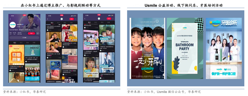 經典案例:根據小紅書、Usmile微信公眾號、華泰研究等綜合資訊表明,2017 年,Usmile 看中了正處于上升期的小紅書,彼時其 Y1 系列新品剛上市,Y1 延續 U1 的馬卡龍配色,外觀更加清新少女,在以女性為主要用戶群的小紅書,Y1 系列迅速走紅,至今銷量突破 405 萬,目前仍然是 Usmile 最受歡迎的產品。同時截至2021年5月,Usmile 品牌入駐超 5000 家線下門店,開始著重布局口腔機構這類專業渠道,積極開拓特渠渠道(已與 18 家主流銀行達成合作,產品進入銀行商城)。