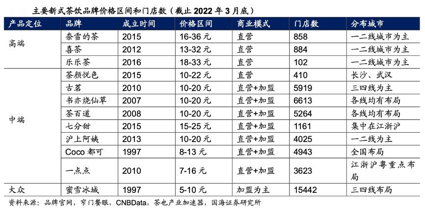 經典案例:根據品牌官網、窄門餐眼、CBNData、茶也產業加速器、國海證券 研究所等綜合資訊表明,主要新式茶飲品牌分化突出,一二線城市以高端品牌為主,低線城市更多是中端及大眾品牌。