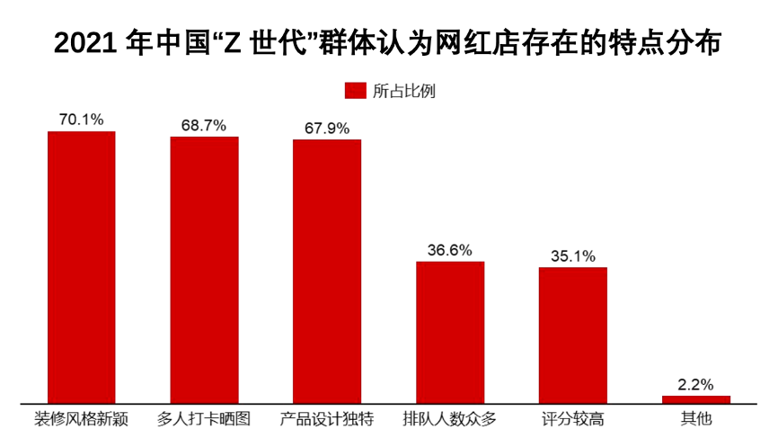 經典案例:根據CCFA《餐飲行業:2021年中國連鎖餐飲行業報告》等綜合資訊表明,新一批茶飲、網紅餐廳滿足了 Z 世代消費者的顏值需求,實現了產品和品牌的迅速的打爆和擴張。根據相關調研,Z世代群體認為自己愿意去網紅店消費,主要的原因是裝修風格新穎、能夠多人打卡曬圖和產品設計獨特。說明大量 Z 世代愿意去網紅店 打卡主要還是因為餐廳/菜品的顏值和受到營銷種草。