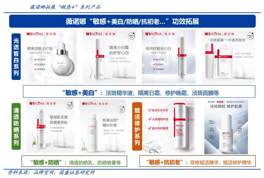 經(jīng)典案例:根據(jù)品牌官網(wǎng)、國盛證券研究所等綜合資訊表明,薇諾娜通過成功打造舒敏系列有效滿足了敏感肌人群基礎(chǔ)的屏障修護(hù)需求,進(jìn)而針對敏感肌人群的多種進(jìn) 階需求進(jìn)行布局,如美白、防曬、抗初老等,分別打造了光透皙白系列(在舒緩修護(hù)的 基礎(chǔ)上兼具美白淡斑功效)、清透防曬系列(溫和穩(wěn)定,無需卸妝)、賦活精華液(可在 修護(hù)維穩(wěn)的同時實(shí)現(xiàn)抗初老功效)。通過功效不斷延申,覆蓋敏感肌用戶多重使用場景,其深化品牌敏感肌專家形象的同時打造銷售端高天花板。