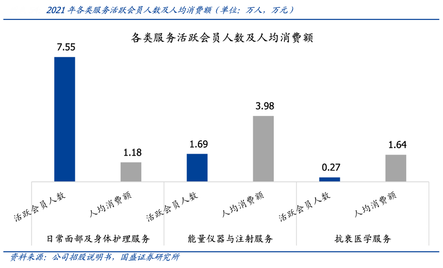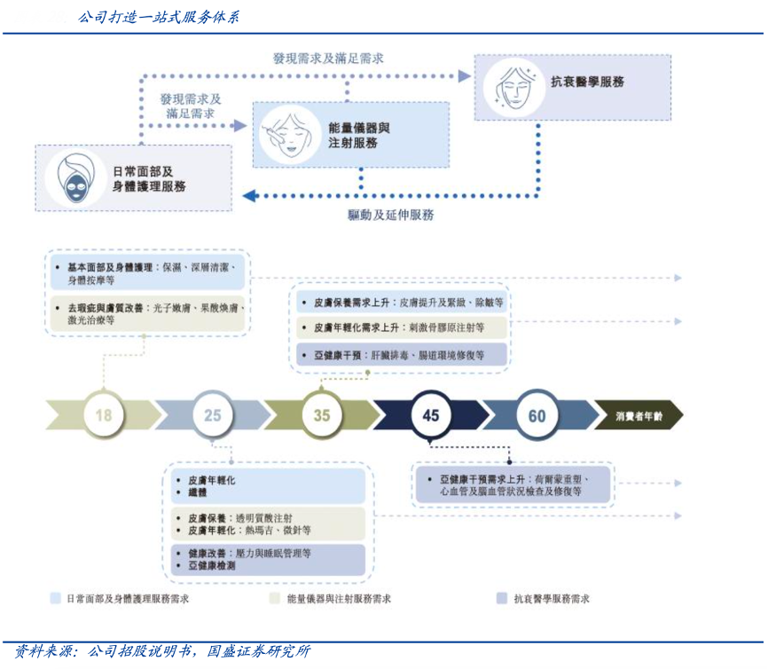 經典案例:根據公司招股說明書、國盛證券研究所等綜合資訊表明,美麗田園公司建立多元服務體系,通過日常面部及身體護理服務初步獲客,進而延伸至能量儀器與注射服務及抗衰醫學服務等進階 服務。截至 2022 年 4 月,共涵蓋 47 類服務項目,超過 800 個 SKU,跨越客戶全生命周期。不同項目之間可形成協同效應共同提升客單及留存,日常護理業務活躍會員數為 7.6 萬,導流至輕醫美及抗衰部分業務的活躍會員數分別 1.7 萬/0.3 萬人,占比約26.3%。