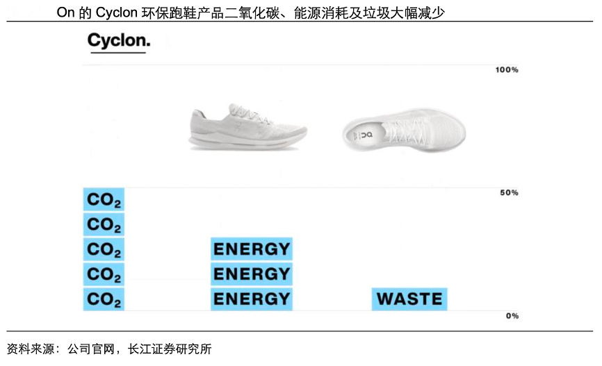 經(jīng)典案例:根據(jù)公司官網(wǎng)、長江證券研究所等綜合資訊表明,On 在其成立一個月后就獲得了 ISPO(唯一 面向全球運動行業(yè)產(chǎn)品的權(quán)威評選)新品牌獎。同時,On的Cyclon環(huán)保跑鞋產(chǎn)品二氧化碳、能源消耗及垃圾大幅減少。